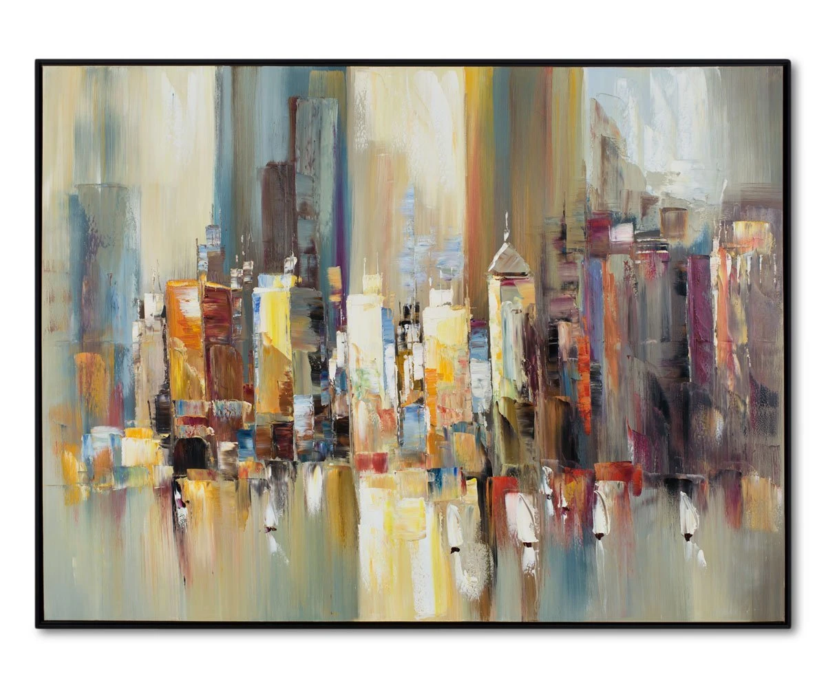 In the Vickery I Oil Painting, moody highlights and painterly vertical strokes combine to create an impression of a city landscape with a blend of warm and cool tones.