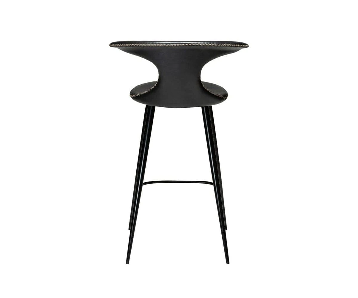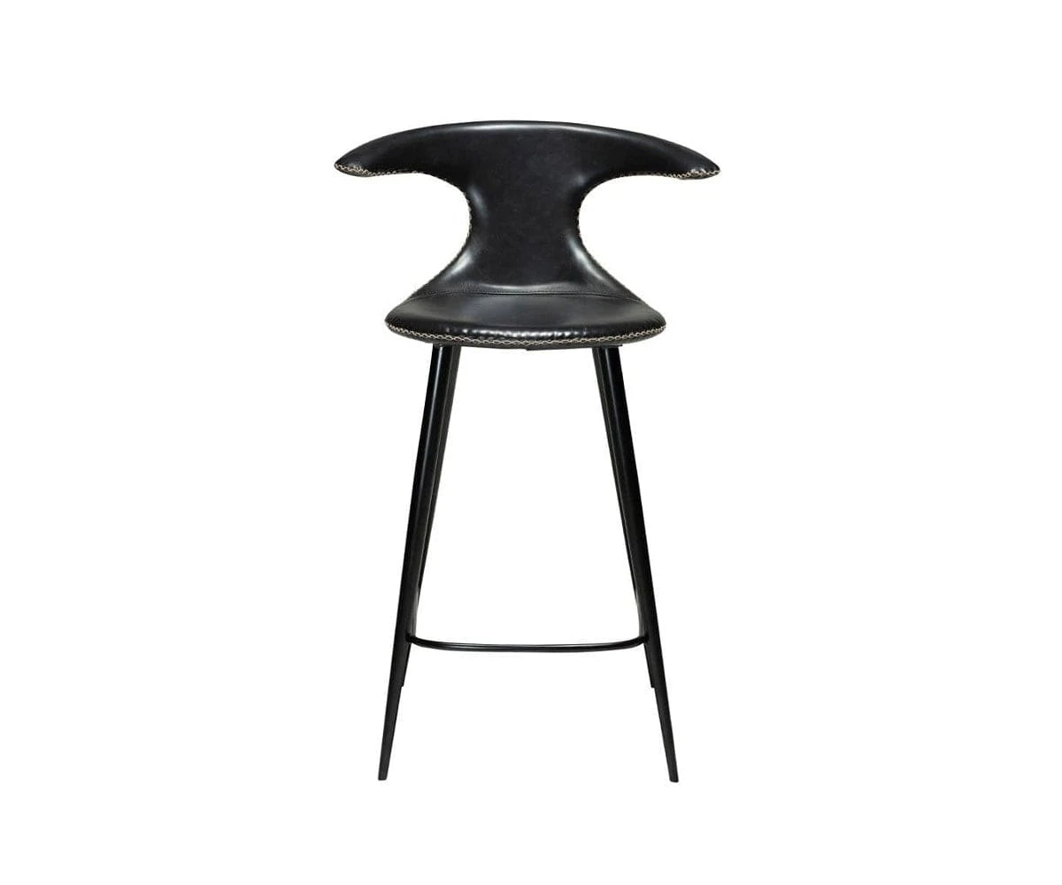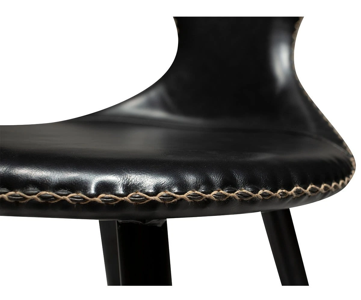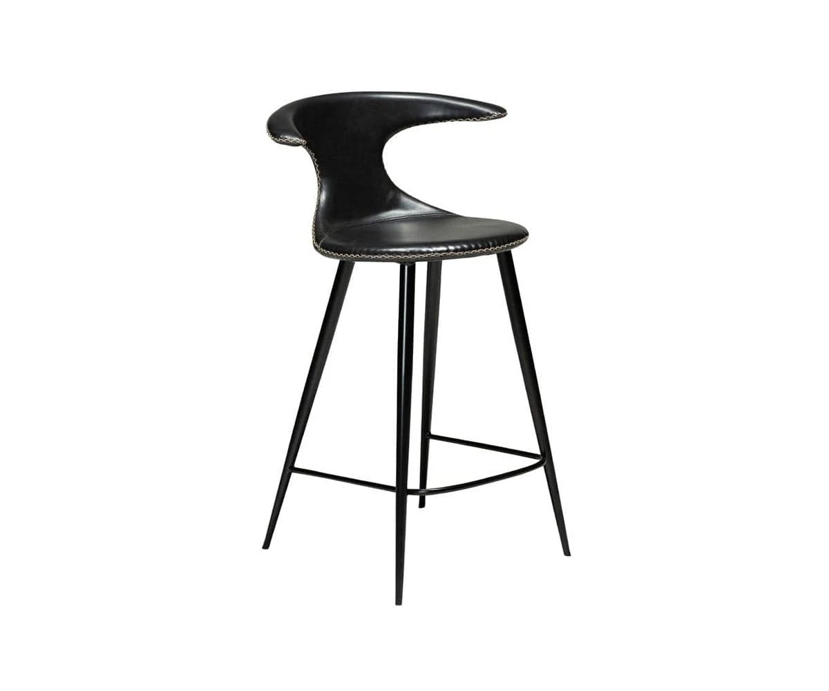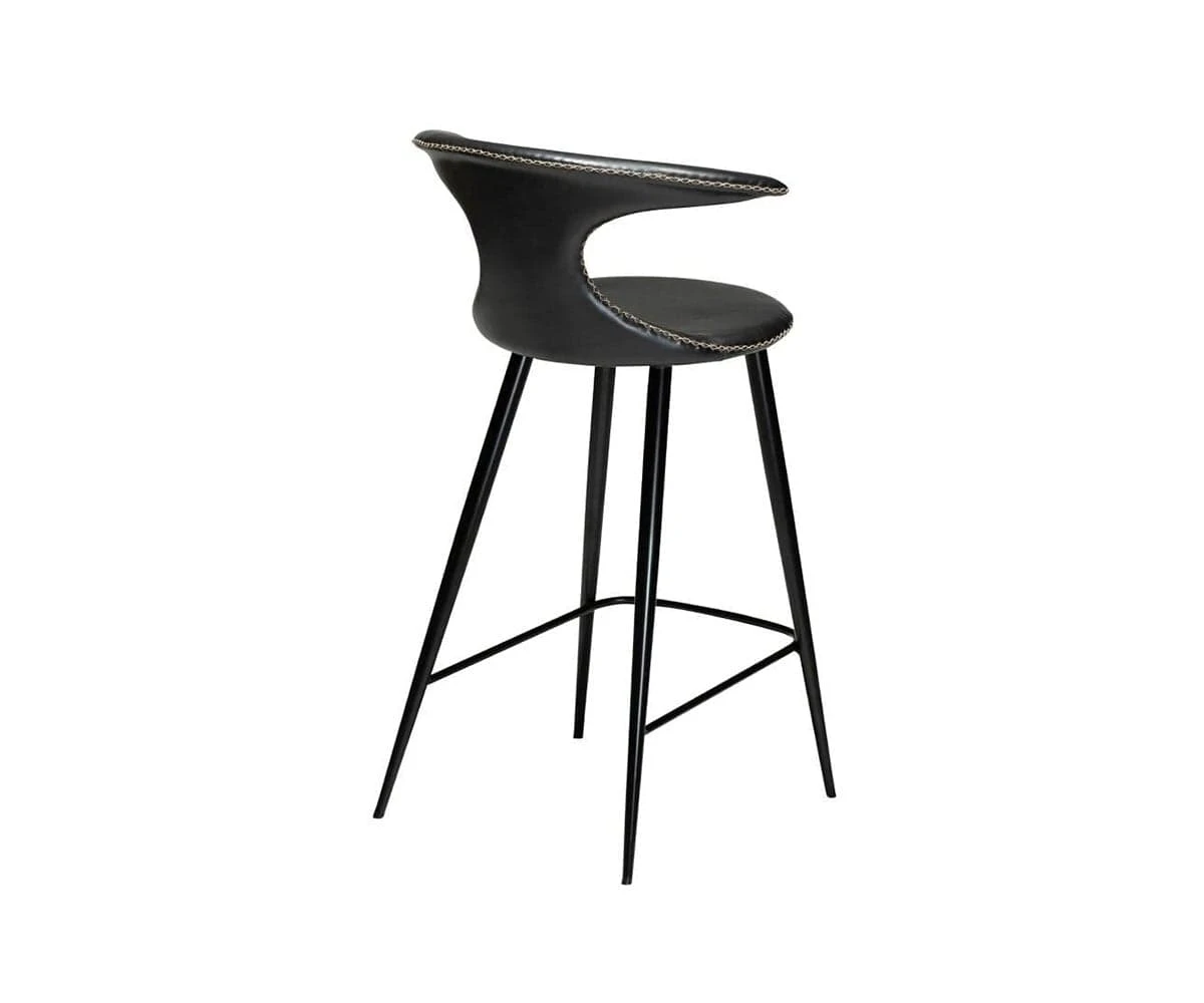 The Drake Counter Stool brings a combination of rustic industrial style and modern Danish design to your home. A sturdy industrial frame features a matte black powder-coated finish, with legs that taper to subtly exaggerated points beneath the added footrest. A round seat is topped by arms that curve uniquely into the shape of a bullhorn. Upholstered in smooth faux leather, this counter stool is accented with rustic contrasting stitching that speaks to stylish western influences.