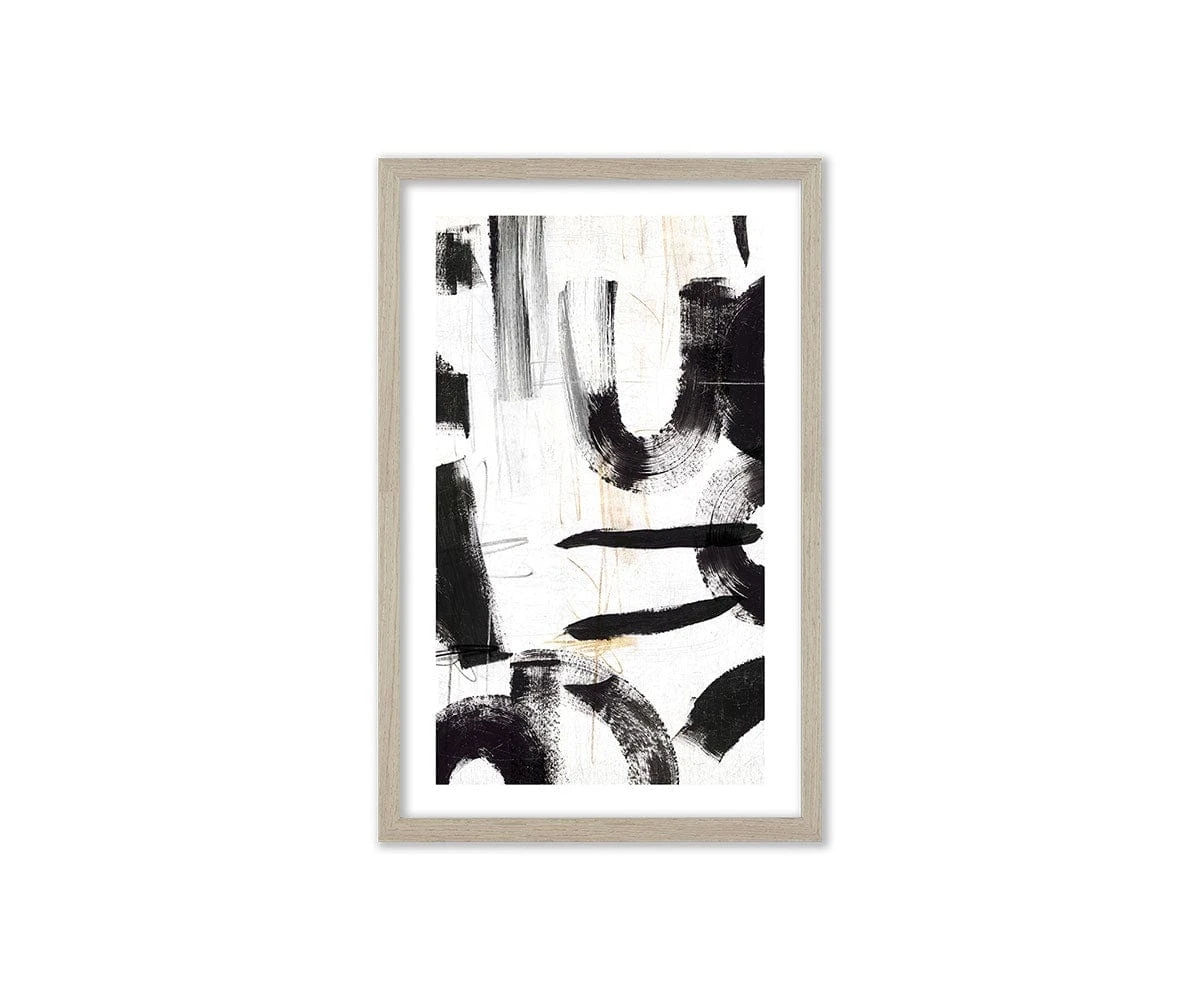 The framed Paper Thoughts II print features a contemporary blend of whimsical, abstract shapes. Starkly contrasting shades of black and white juxtapose to create an eye-catching work of art worthy of any modern space.