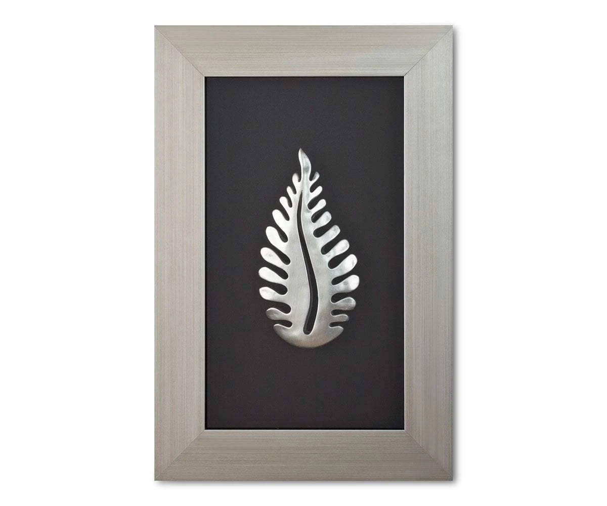 A fern frond is immortalized as a small silver sculpture in the Tamalpais II Wall Sculpture. The black background and wide contrasting silver colored frame adds contrast and drama.