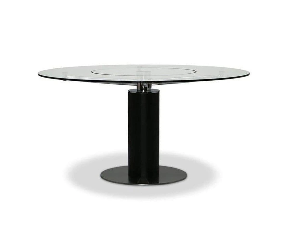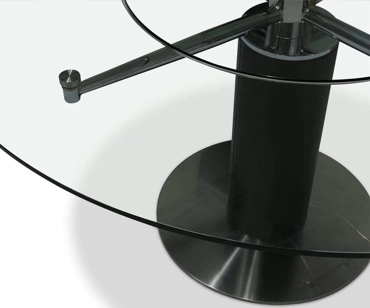 Thanks to the Lauss Dining Table, your brunch-to-lunch game just went up a notch.Β Start with a durable, stainless steel base. Wrap it in smooth, regenerated leather for a subtly dramatic flourish. Top it off (literally) with a tempered glass tabletop featuring a seamlessly integrated revolving tray that spins 360Β° to conveniently serve guests.