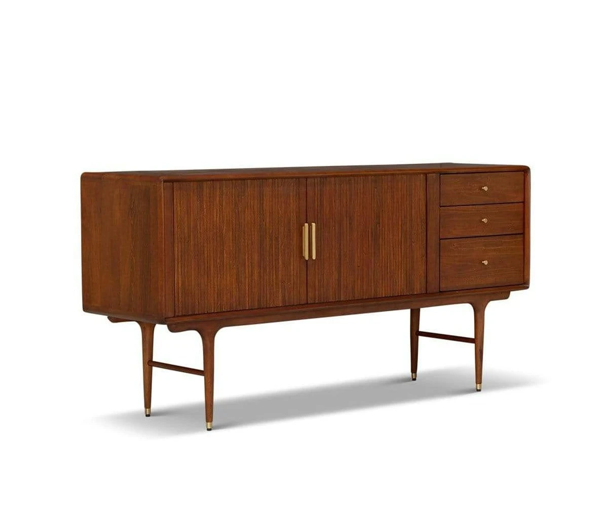 The Hendrick Sideboard is the solution for all of your entertaining needs. Two large tambour doors slide open to reveal three drawers and ample space for bar essentials, media accouterments, games and more. The space-saving tambour doors, made of narrow slats, slide open for easy access to your stored items, while adjustable shelving allows for you to customize your storage space to meet your needs. Solid brass pulls and leg caps contrast beautifully with the American poplar wood.