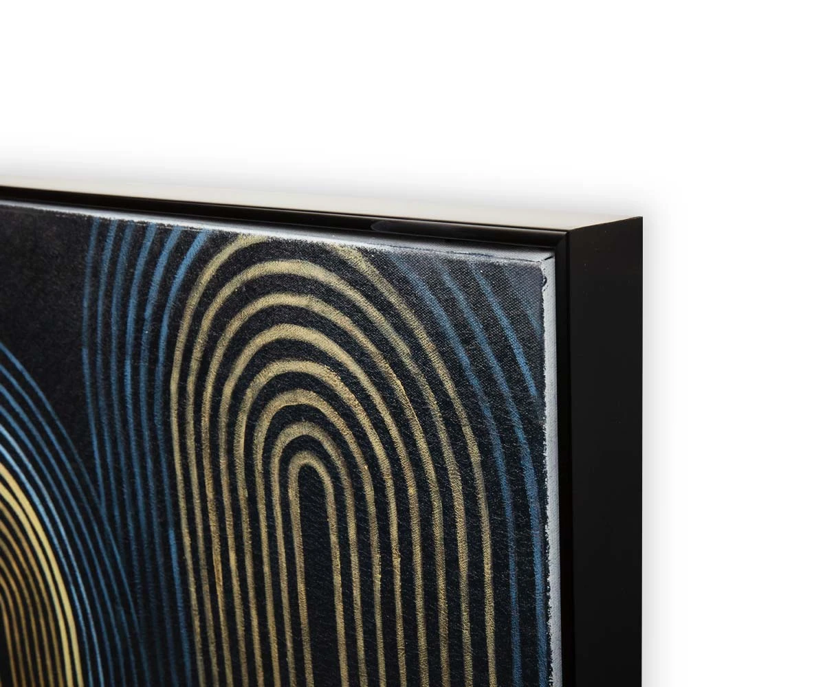 Anchor your aesthetic with the rich, dark hues of the Midnight I Oil Painting. Inspired by the vibrant contrasts and clean lines found in pop art, this piece showcases the inky curve of arches punctuated by bright lines that lend themselves to a dimensional, dynamic feeling. Hand-painted with 100% oil paint on canvas and set in a black frame, this modern piece pairs well with the Midnight II Oil Painting. Hang this duo on a wall together to create a gallery wall effect, or pair with the Midnight Mountain Oil Painting for a cohesive set of pieces that naturally infuse your space with a midnight motif.ย Midnight II Oil Painting andย Midnight Mountain Oil Painting each sold separately.
