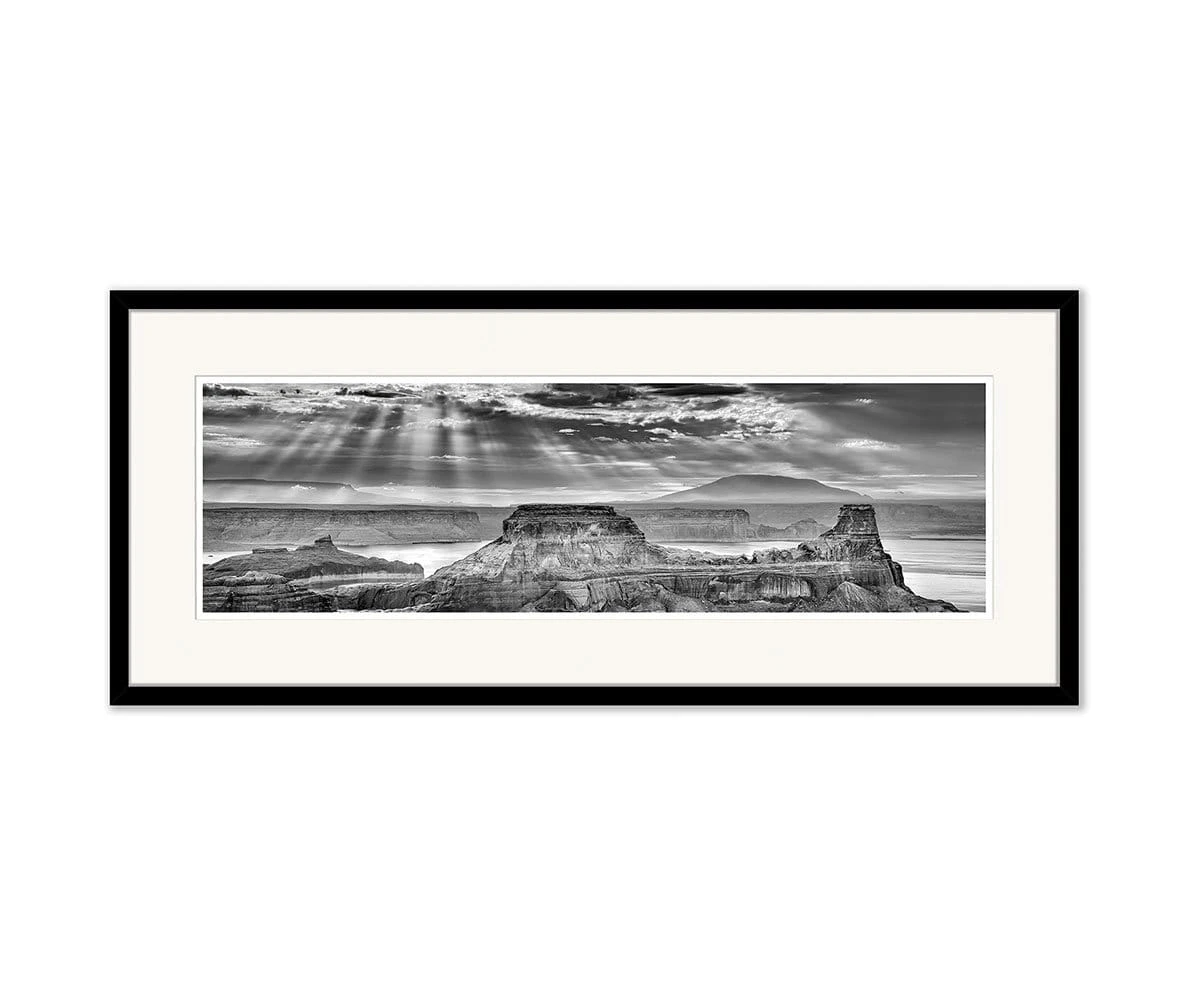 Bring all the majesty of wide open spaces into your home with Vast Wildness Wall Art. This long framed landscape comes ready to make a statement: featuring a black and white canyon landscape and dramatic sunbeams filtering down through clouds, this piece is equal parts striking and grand.