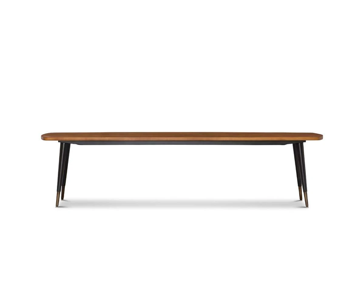 The Lanson Bench in light walnut offers stylish, streamlined seating with an elegant mid-century profile. Crafted from American poplar wood, the oblong bench is elevated with tall, tapered legs. The black legs finished with brass caps complete this modern look.