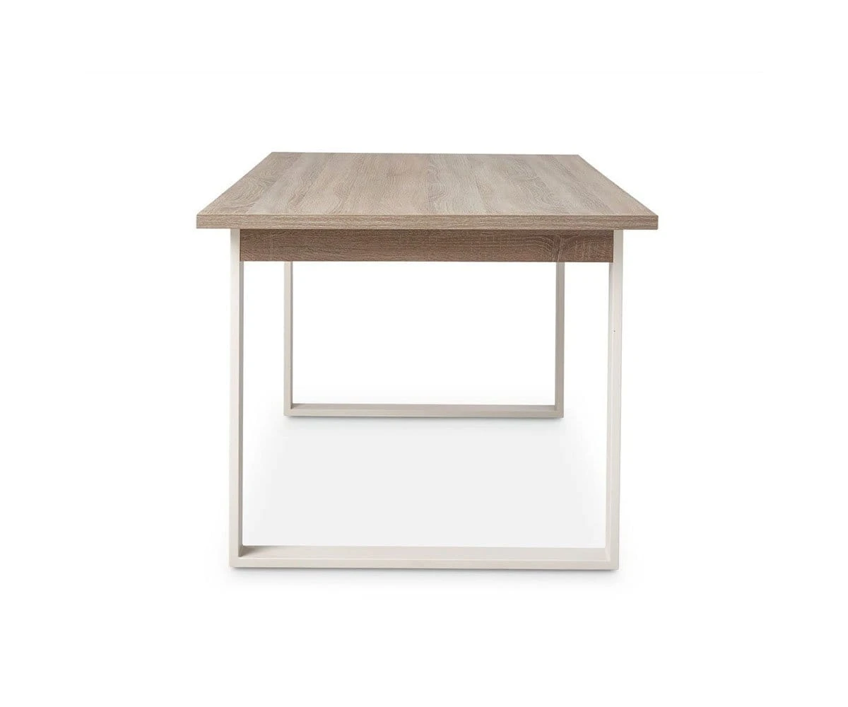 Made in Italy from eco-friendly recycled materials, the Gammel Dining Table embodies simple, understated elegance. Its neutral colors and linear look bring a light and airy aesthetic to your dining space, while strong eco-friendly recycled materials ensure longevity. A durable, easily-cleaned melamine surface is designed to mirror the look of real wood complete with intentional, rustic saw marks that highlight the natural characteristics of this piece, while matte white metal legs support the natural wood-styled top for a versatile and modern aesthetic. Dress up this key dining room piece with chairs that display an intricate design, or keep it casual with a seat that mimics the minimalistic lines.