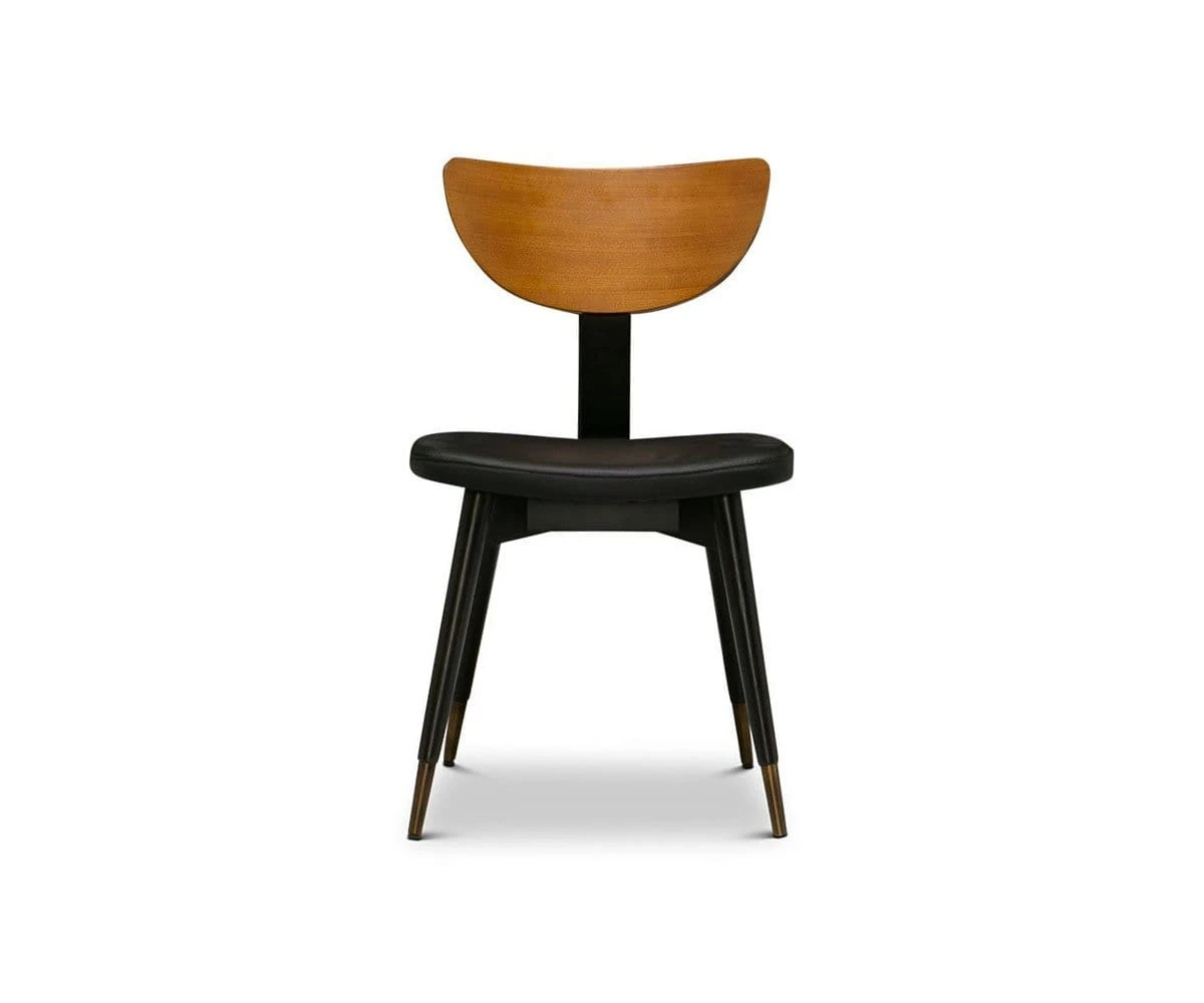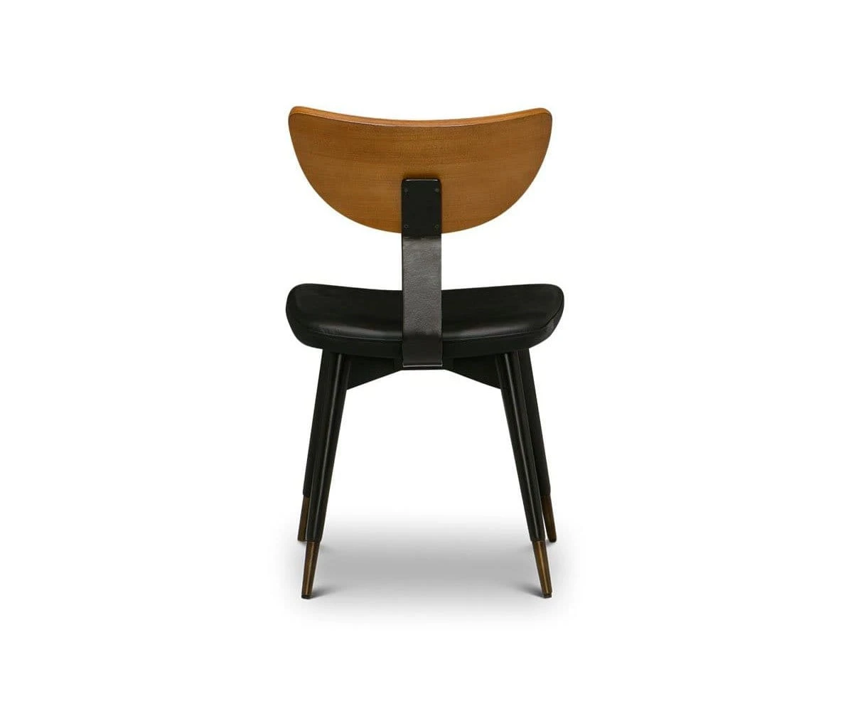 Pair the Lanson Dining Chair with your Lanson Dining Table for a complete mid-century approach to eating in style. The atomic-inspired frame features a bentwood backrest with a light walnut stain, black tapered legs, and solid brass caps. Black faux leather upholstery covers the padded seat.
