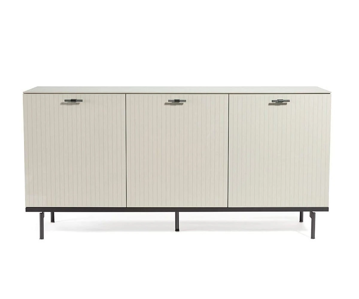 The Niccola Sideboard brings streamlined luxury to your space. High-quality surfaces shine in contrast with the brushed metal hardware that accents this piece. Spacious cupboards and a drawer provide ample storage to tuck away all your necessities. Subtle pinstriped detailing adds stylish texture to this elegant sideboard, which is a true example of modern contemporary glamour.