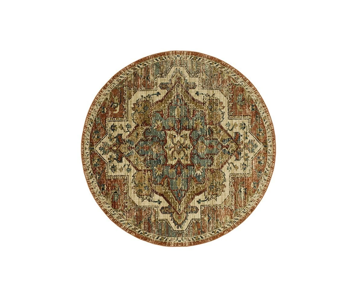 Persian-inspired with a touch of boho, the Kasbar Round Rugβdesigned and produced in the USA by Karastan, a leader in eco-friendly rugsβimbues your space with classic vibes. Faded red, turquoise, and sand tones get a vintage flourish, thanks to intentional distressing throughout. Made from EverStrandTM, a premium recycled fiber made using 100% recycled plastic bottles, this rug is incredibly durable with inherent fade and stain resistance, yet feels soft to the touch.
