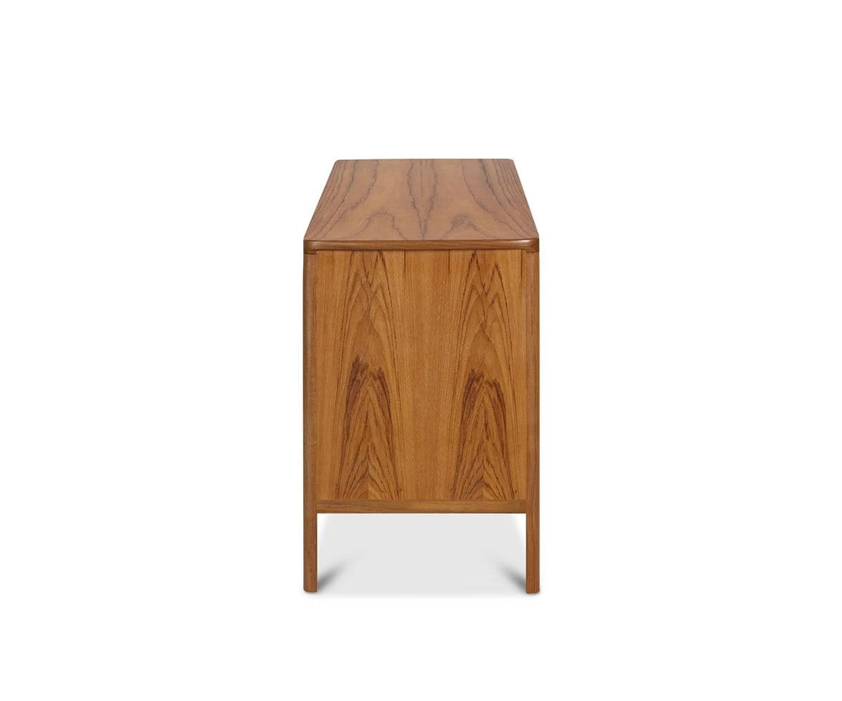 Inspired by mid-century modern style, the Orvar Sideboard is elegant, timeless and versatile. Crafted from teak, this piece boasts linear appeal with a stout profile elevated by thin yet durable legs for an airy feel. Three large drawers and two cabinets provide ample space for hosting and dining accoutrement.