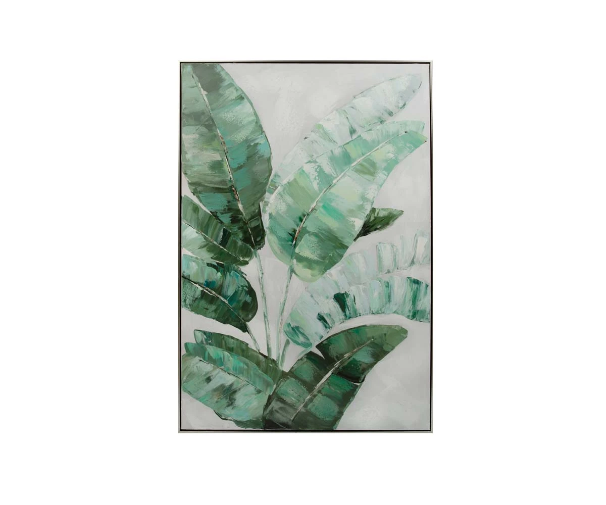 The Tropical Breeze I Oil Painting brings to mind thoughts of lush, leafy palm fronds waving gently in a balmy island breeze. Hand-painted on canvas with 100% oil paint, this piece features wide, heavy brush strokes that add to the modern, organic feeling of this painting, while the carefully-depicted palm leaves bring a modern sense of island luxury to any space. A silver frame adds a hint of contemporary glamour, making this a transitional piece that’s easily paired with any number of motifs or decor styles. Partner this painting with the Tropical Breeze II Oil Painting to reinforce a relaxing, leafy motif and to bring welcome shades of soothing, tropical green into your space. Tropical Breeze II Oil Painting sold separately.
