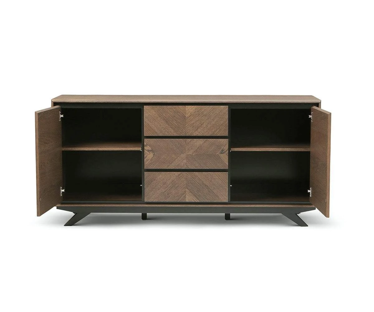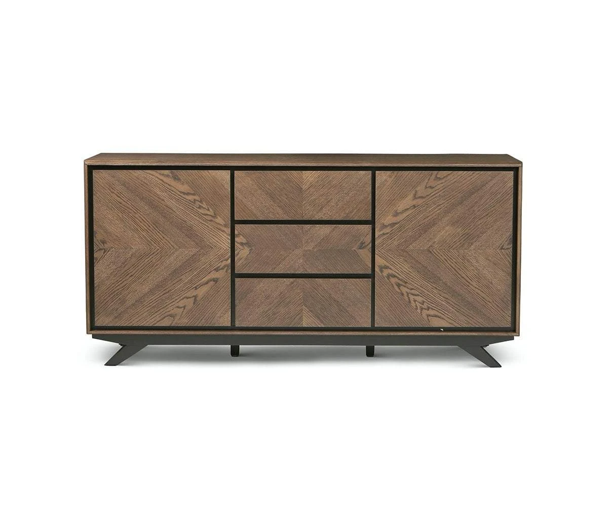 More than just a storage solution, the Raynor Sideboard is a statement piece. From its chevron wood grain pattern displayed across two side doors and three drawers, to the intriguing solid beech base with tapered and angled legs, this mid-century modern dining room addition is as much about style as it is about function. Keep linens, silverware, dinnerware or glasses close by, while creating a organized and curated look for your gathering spot.