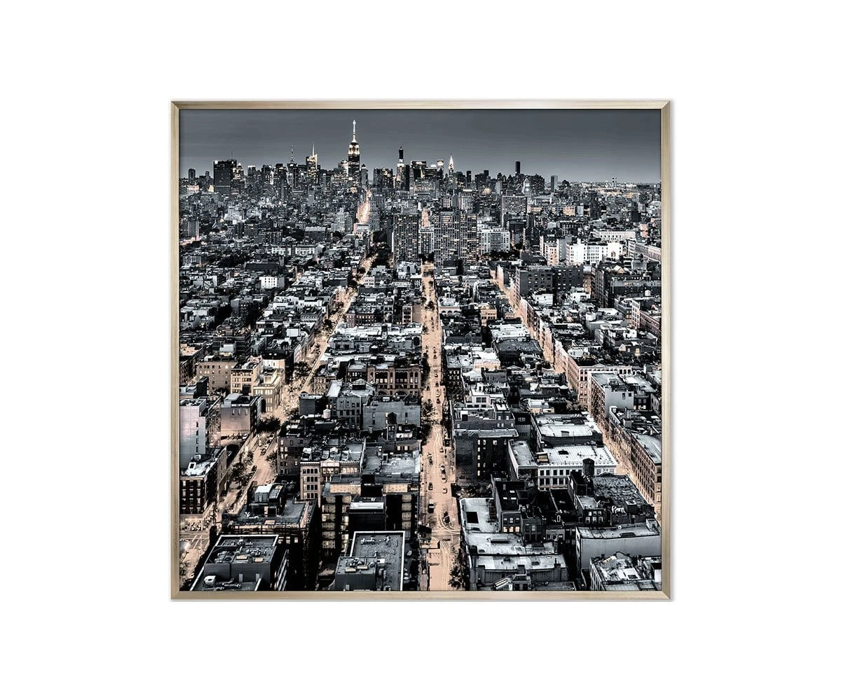 The Silvery Synergy print features an aerial view of cityscape in subtly contrasting hues of silver and gold. This twilight scene allows the viewer to fall headfirst into the hustle and bustle of a glittering metropolis. Add this piece to your collection for a touch of urban glamour.
