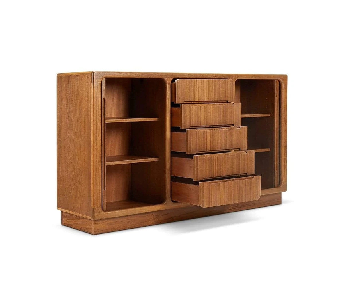 The Evon Sideboard is highlighted by a natural finish that showcases the organic grain of the solid teak wood. Five drawers, four shelves and two doors offer ample room for storage, making this sideboard an ideal addition to any home. Contemporary in design, the design of this piece lends itself beautifully to modern or transitional decor.