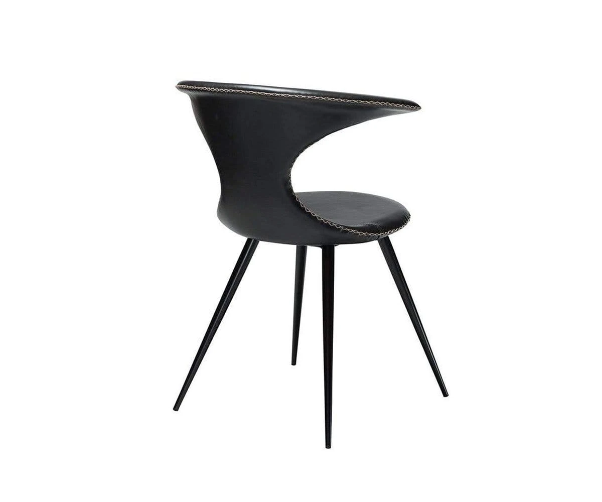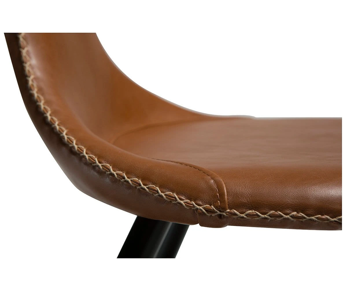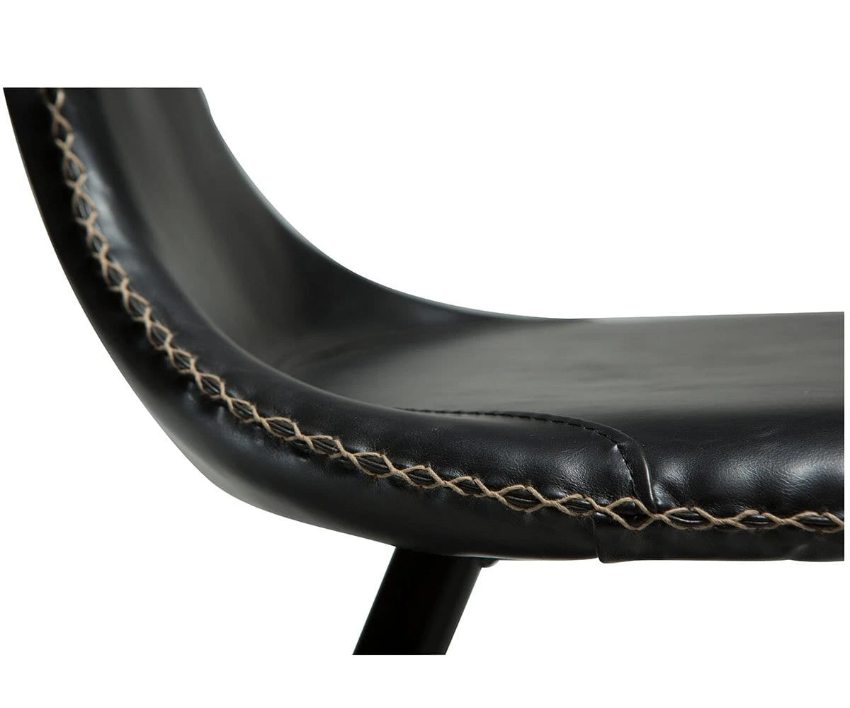 The Drake Chair is the perfect rustic industrial accent piece for your dining area. A round seat topped with uniquely curving arms echoes the classic western shape of a bullhorn. Upholstered in smooth faux leather, this chair is accented with contrasting stitching that speaks to rustic and modern Danish influences. A sturdy industrial frame features a matte black powder-coated finish, and legs that taper to subtly exaggerated points.