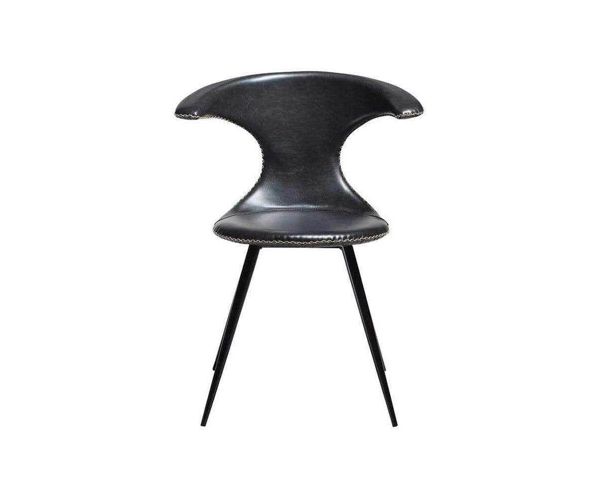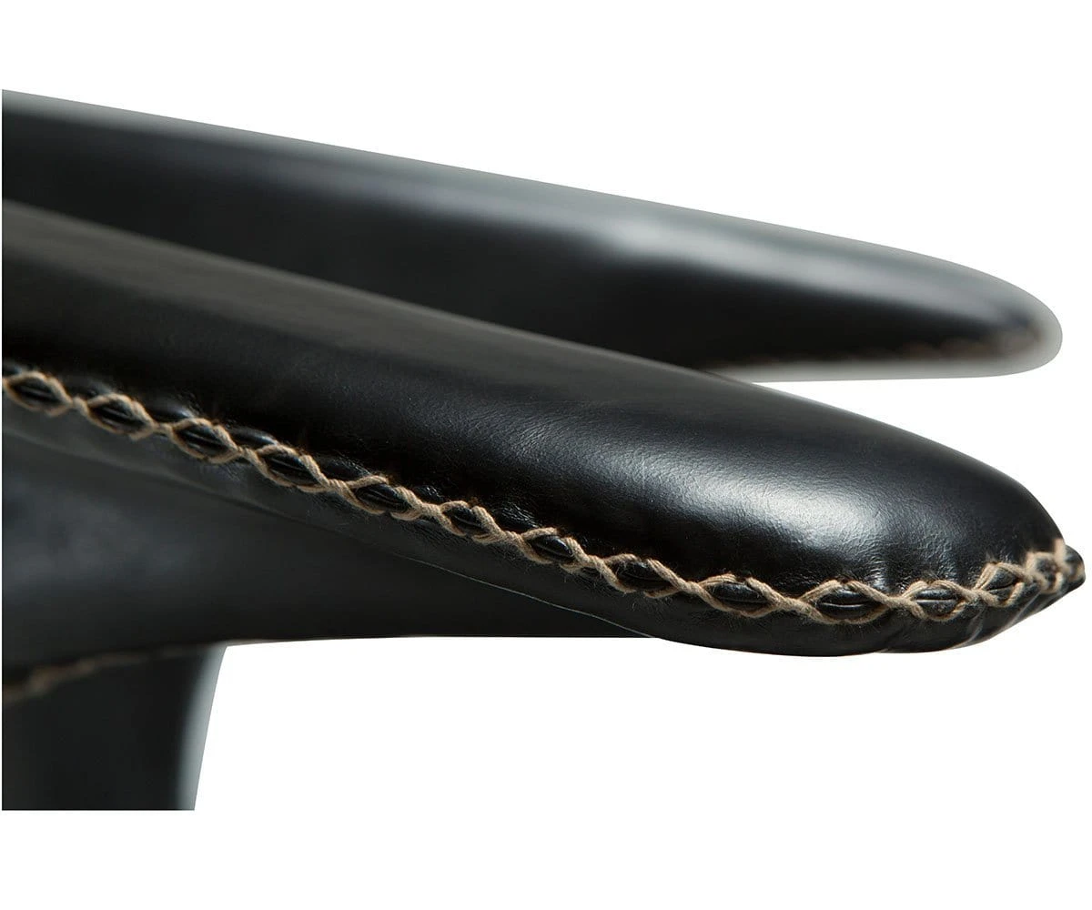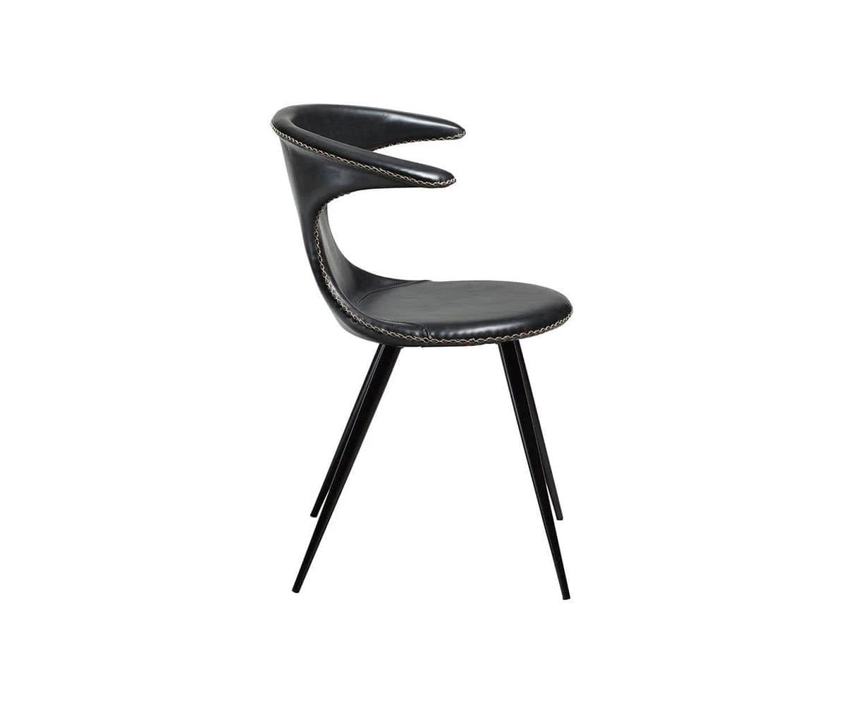 The Drake Chair is the perfect rustic industrial accent piece for your dining area. A round seat topped with uniquely curving arms echoes the classic western shape of a bullhorn. Upholstered in smooth faux leather, this chair is accented with contrasting stitching that speaks to rustic and modern Danish influences. A sturdy industrial frame features a matte black powder-coated finish, and legs that taper to subtly exaggerated points.