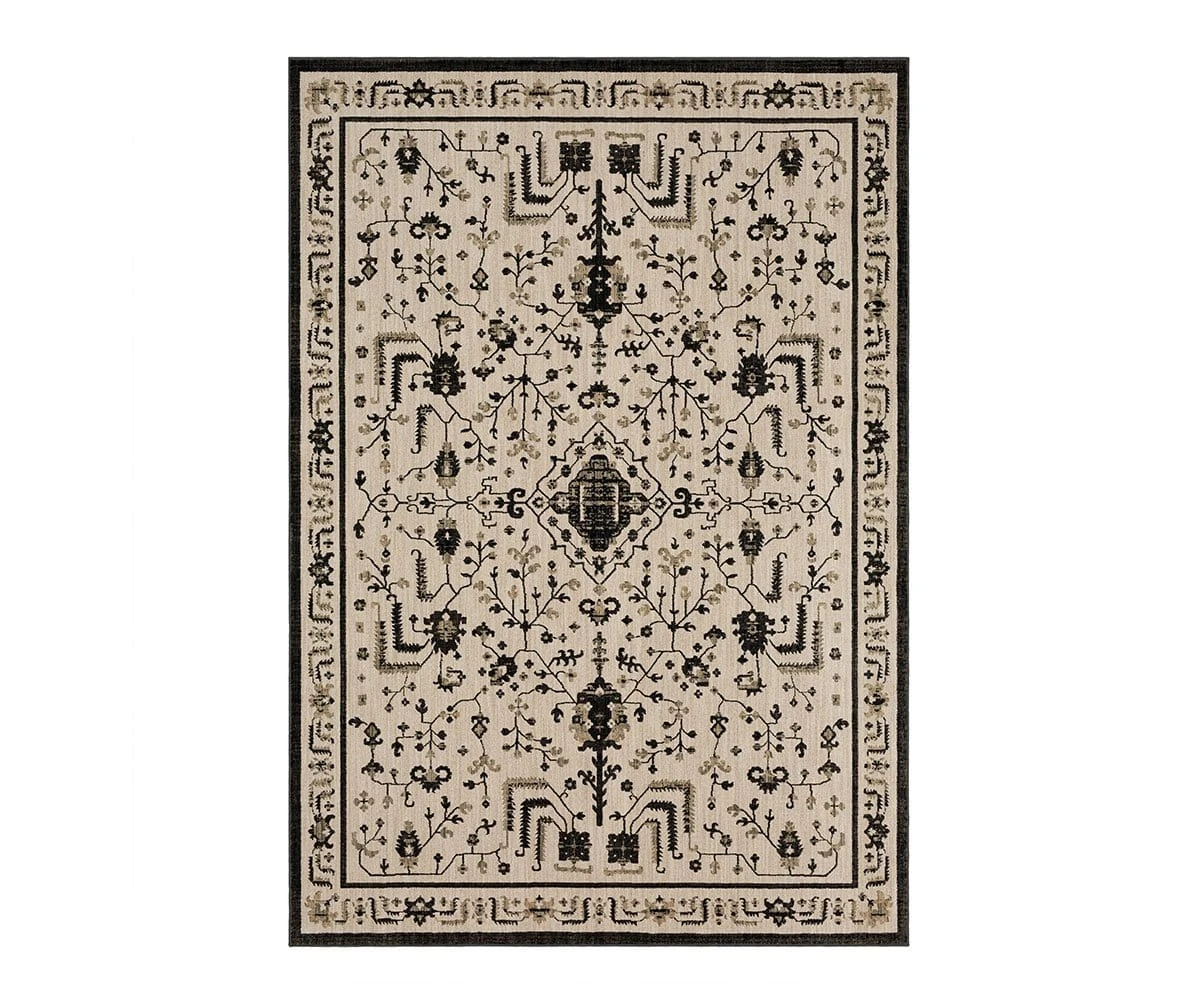 The Elements Colmar Onyx Rug features a motif based in angular floral patterns. The dark, intricate design contrasts cleanly with shades of pale parchment, making this rug an ideal addition to a modern or rustic setting. This eco-friendly design was made in the USA from premium recycled plastic bottles that go through a transformation process to create strong, soft fibers. The result is this beautiful rug that offers superior durability and easy care while remaining remarkably soft to the touch.