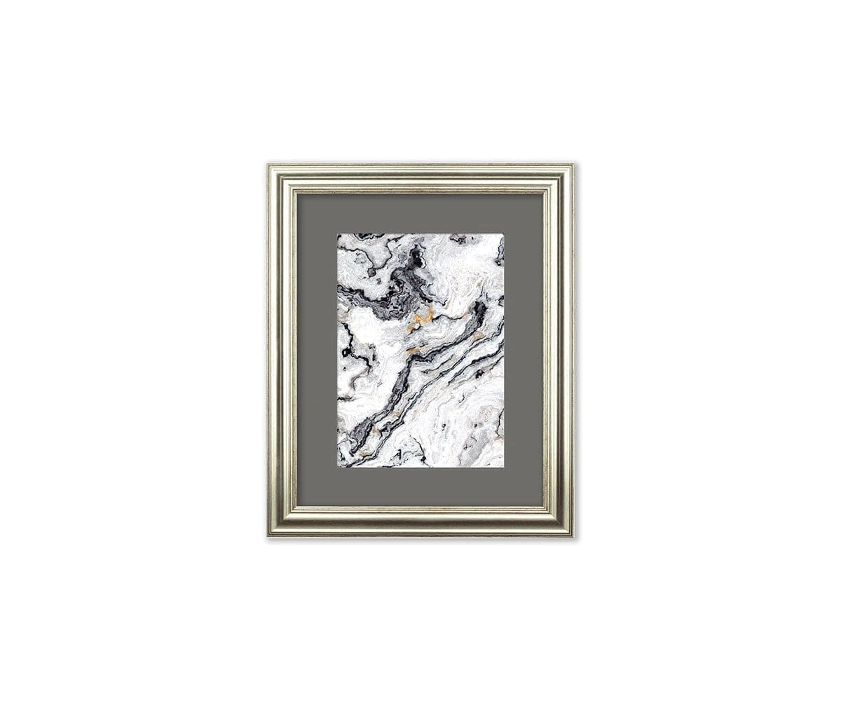 The swooping lines of the framed Silvery Surrealism I print are both abstract and opulent. Reminiscent of marble with its ebbing and flowing striations, this piece brings a sense of elegant minimalism to any room in which it is displayed. Hang this piece by itself for a solo statement, or pair it with the framed Silvery Surrealism II print to complete the look.