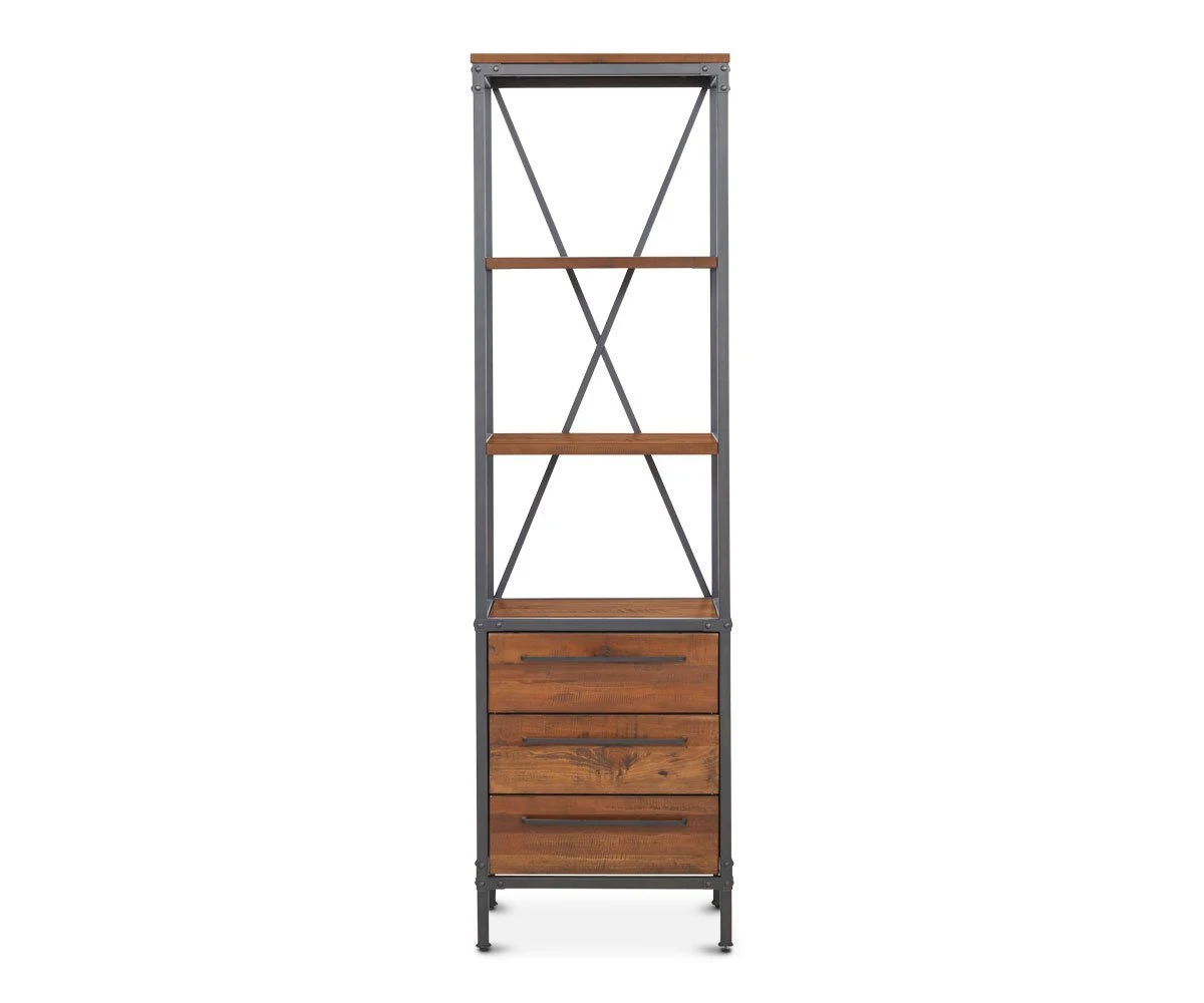 With a strong rustic industrial style, the Insigna Etagere Bookcase adds fills small spaces with striking charm. This piece features three drawers and two solid American poplar fixed shelves with a natural antique stain. These rustic elements are offset by an anchoring iron base and iron accents.