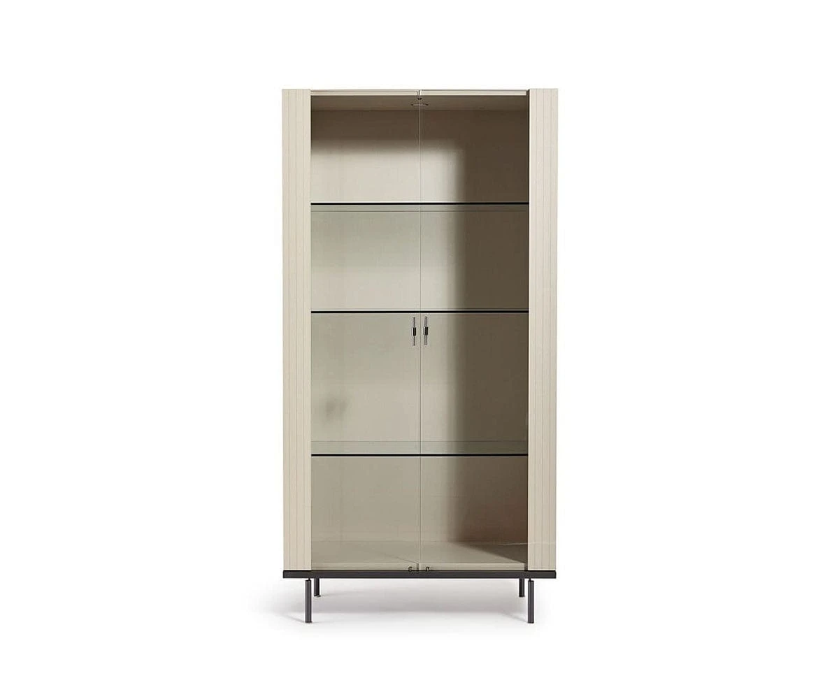 The perfect place for storing your go-to necessities, the Niccola Curio is an elegant statement piece. This Italian-crafted piece shines with a high-gloss finish while pinstriped accents add stylish texture and an air of modern contemporary glamour. Brushed metal hardware elevates this piece with a sense of streamlined luxury. Glass shelves and doors support and protect your belongings, while convenient lighting within this piece makes them easy to see at all times.