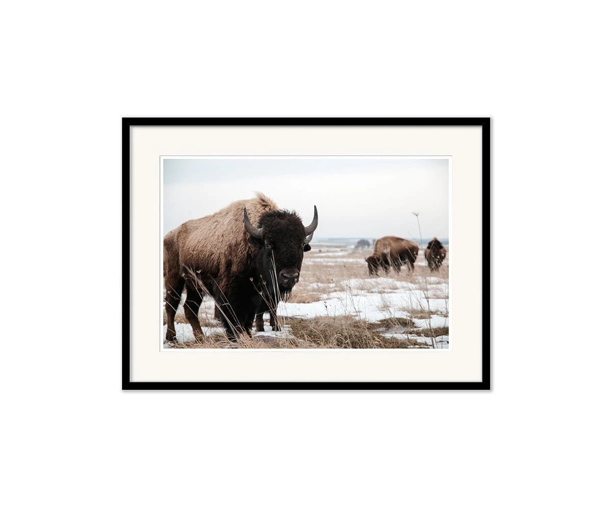 Rustic Retrospective brings a sense of open plains and untamed wilderness to mind. This framed print depicts a herd of bison grazing peacefully among scattered snowdrifts and tufts of grass. Add this piece to your any room to cement a wild and wintery aesthetic in your space.
