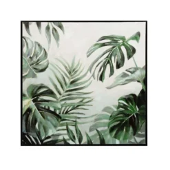 The Jungle II View Oil Painting depicts a wild tangle of emerald monstera and leafy palms twined in a misty jungle setting. Inspired by the idea of looking out a window to the untamed tropical beauty of a jungle, this piece is hand-painted with 100% oil painting on canvas, and invites you to catch a glimpse into the unknown. A black frame echoes the darker tones found in this versatile painting, which can easily make the transition between any number of decor styles while ensuring that rich, luxurious green hues are effortlessly added to any room. Pair this piece with the Jungle View I Oil Painting to create a gallery wall, or display pieces on opposing walls to complete your lush jungle view in style. Jungle View I Oil Painting sold separately.