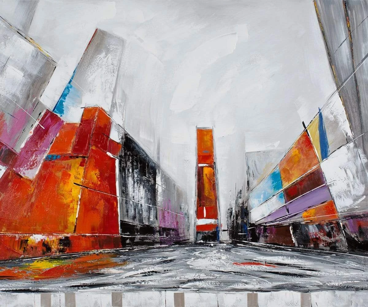 Contemporary spaces will benefit from the addition of the Parcid Painting, which depicts an abstract industrial scene in vivid colors. Muted greys provide stark contrast to create an emotionally moving piece.