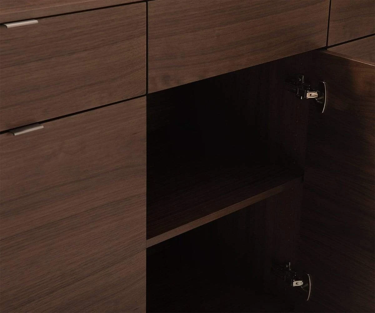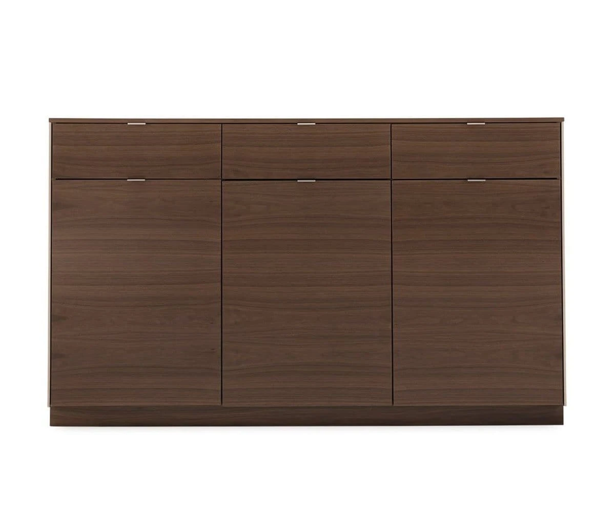 The Thisted Sideboard is simplicity refined. Sleek aluminum handles are accented by a walnut finish, and subtle strips of aluminum trace the front edges of this minimalistic piece. The artful lines of this sideboard work in perfect harmony with the Thisted Table, which is a dramatic counterpart to this piece. Providing ample storage for your dining needs and more, this sideboard features three doors, three drawers and six shelves.