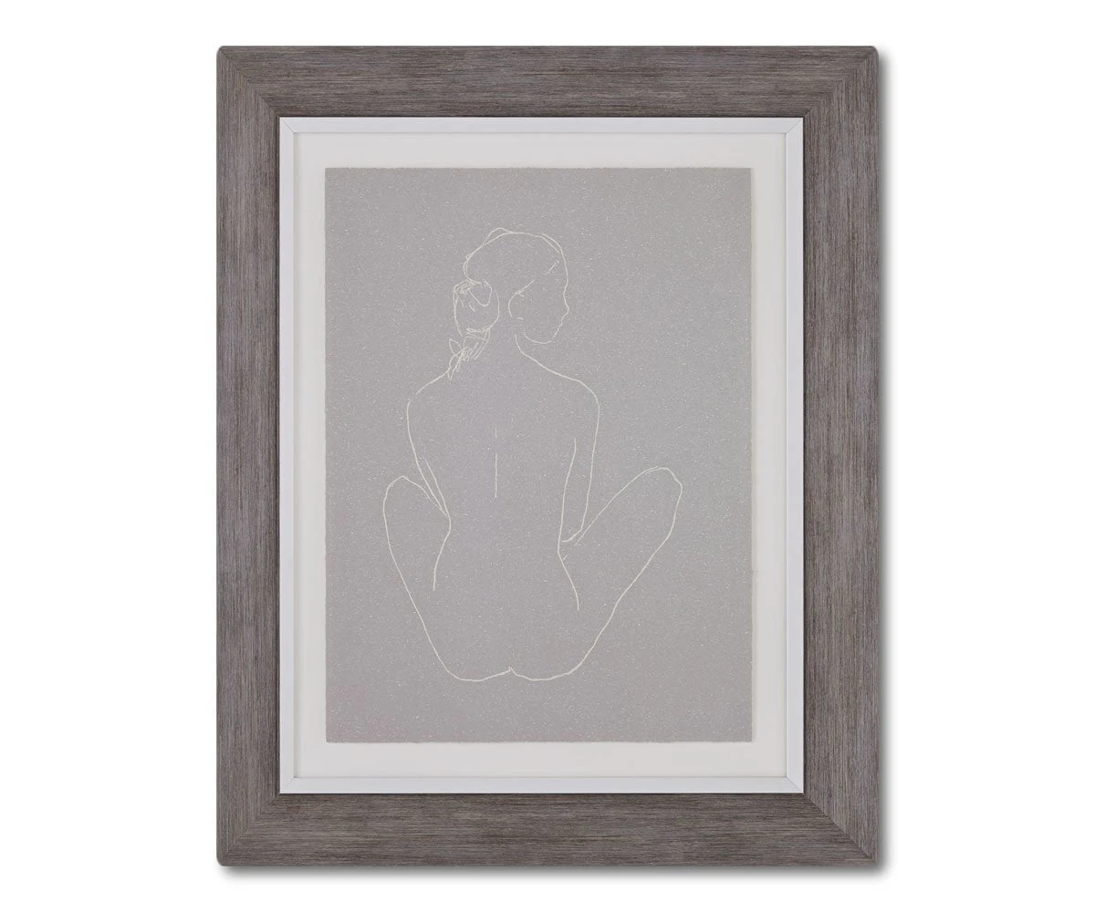 The Tranquil Composition I subtly infuses calm into your space. This minimalist line drawing of the resting woman resembles a modern masterpiece. The neutral color palette sets the tone, from the design to the torn edges of the paper and completed by the wooden frame.