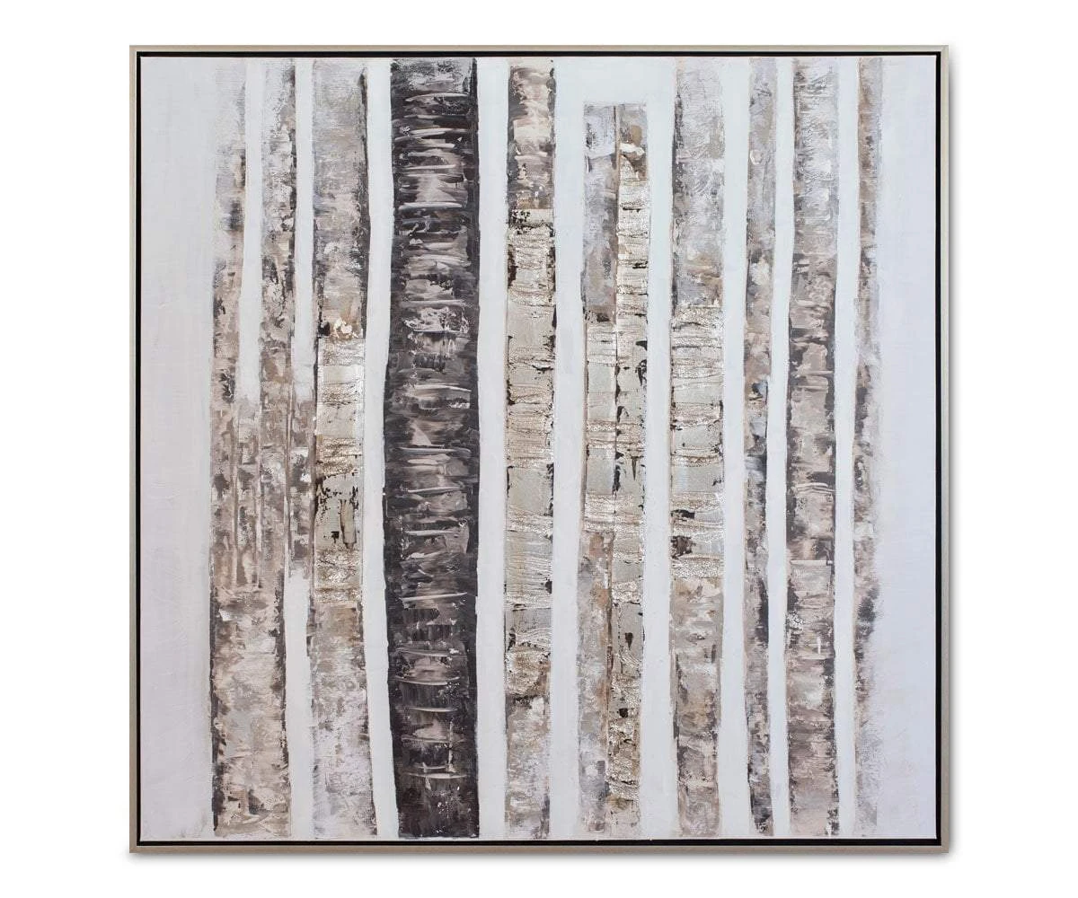 Add subtle movement and natural texture to your walls with the Ionis I Oil Painting. Tree trunks in varying shades are set against a foggy pale grey background. Includes metallic touches throughout and is finished with a thin silver colored frame.